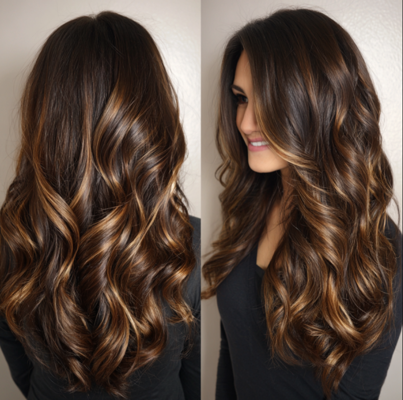 Dark brown hair paired with caramel balayage creates stunning contrast.