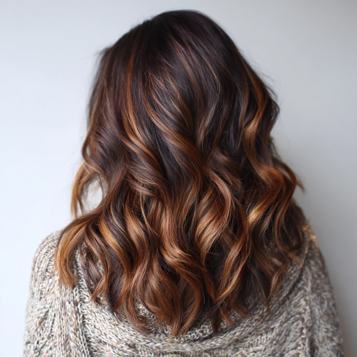 Chocolate brown hair mixed with caramel highlights creates a rich and luxurious color palette.